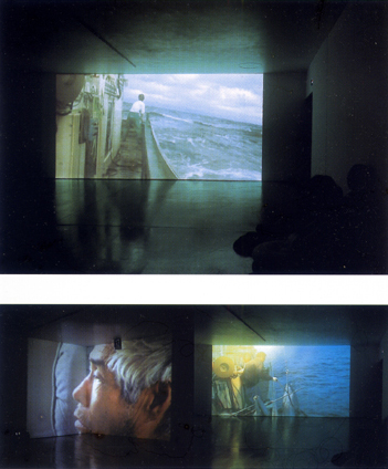 The Last Land 2003 video installation 88min "Vernacular Spirit" Aomori Contemporary Art Centre, Japan related drawing "Last Land",this video work was made on location at the North edge of Japan - Shimokita peninsula is already imprinted in a collective consciousness as the "edge of the Japan". In my opinion, it means to free from social and political formations, and they might be a symbol of new possibility. In this place, making a video of tuna fishing in which is a kind of journey for inner world, tuna is the one of the biggest fish and quite precious one in Japan. Therefore, tuna is a symbol of unexpectedly idea. This video exhibits long time in a day, as same time as my real shooting in the sea. The images of the rough sea make visitor feel sick, so visitors hardly keep watching the image. I make what is reality to tuna-fishing for us and also make us realized the distance between real and the image. I try making real nature scene and relationship both side. |