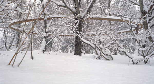The ring will be set up at a height of 5m and 16m in diameter. The weight is 400kg. It will be supported by various broad branches. We will be able to look up at the ring from a distance, but we will not be able to stand on the ring or touch it. After it is set up, I will make an installation in the deep forest. The works will show us that the ring will have changed over time. The ring will be looked at by many people who come to the place. It will be a fabulous experience for strangers walking in the forest. In Summer season, the ring will be covered by many leaves and it will only be seen from some points. But the painted beeswax smell in the ring will attract many bees and insects. Many wild birds will rest on the ring.→
