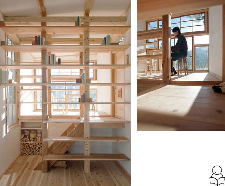 Die Grundstücksfläche der Bibliothek beträgt kompakte 18m2. Sie ist auf einem steilen Hang gebaut und besteht daher aus zwei Zimmern auf zwei Ebenen.
