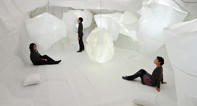 Mino washi, wire, lamps, cables, wood, acrylic plate, 5.1ch amplifier, 5 transducers, 52 min music DVD "Mino"